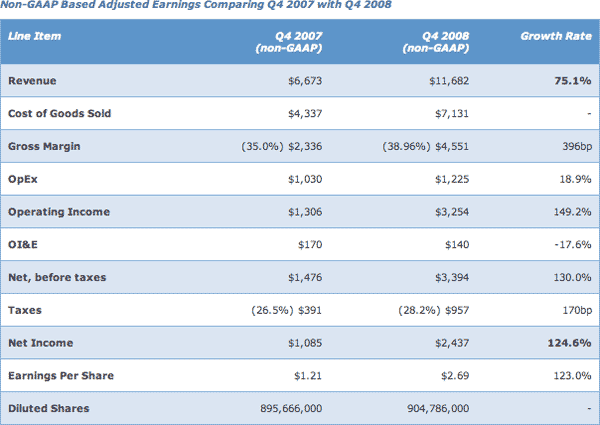 "Aggiustati" i calcoli con le procedure appena abbracciate l'utile netto di Apple passa da 1,085 miliardi del Q4 di un anno fa a 2,437 miliardi dell'ultimo Q4, ovvero una crescita del 124,6%, appunto. Il fatturato invece aumenta del 75,1% passando da 6,673 a 11,682 miliardi di dollari. Il dividendo per azione era 1,21 dollari nel Q4 del 2007 ed adesso è di 2,69 dollari, il 123% in più.