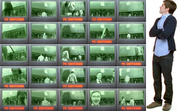 PC, dalla fila di schermi che inquadrano gli ingressi degli Apple Store, vede continuamente "PC switcher" che abbandonano Win per Mac. Si spazientisce e decide che deve fare qualcosa e si reca in uno di questi negozi trattenendo un cliente che stava per entrare.