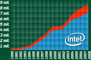 Otto su dieci server attualmente in uso sono basati su processori Intel, accanto vediamo le vendite annuali di Intel in azzurro e della concorrenza in rosso, su dati IDC.