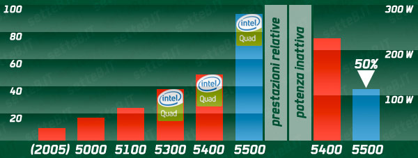 Chi possiede server basati su chip Xeon del 2005 (unico nucleo @ 3,8 GHz e 2 MB di cache) e passerà agli Xeon 5500 (2,93 GHz) noterà un passaggio da 50.970 a 447.000 bops con un incremento delle prestazioni di 8,8 volte per server. Il consumo energetico giornaliero per server passerà da 382 a 315 W e per l'inattività da 228 a 151 W.
