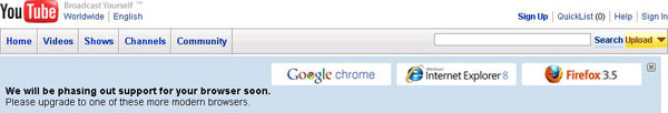 00000a_fotonews001Le versioni più vecchie del browser di Microsoft non saranno più supportate da YouTube e si consiglia agli utenti di aggiornare ad IE 8, FireFox 3.5 o (non stupitevi) a Chrome di Google. Niente Safari ed Opera?