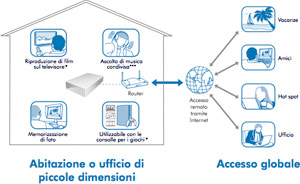 Si tratta di un hard disk esterno dotato di porta Ethernet (oltre che USB 2) per realizzare un network domestico o in un piccolo ufficio, fornisce da 500 GB a 1 TB di dati condivisi sul web anche in assenza di un computer collegato.