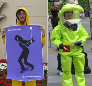 Un gruppo di attivisti ha dimostrato contro le trappole della musica protetta con DRM proprietari. Lo ha fatto davanti ai maggiori negozi statunitensi di Apple con vistose tute colorate e distribuzione di volantini.