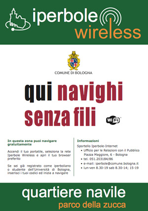 I bolognesi che possiedono un laptop, palmare, smartphone (compresi ovviamente iPhone/iPod touch) abilitato al Wi-Fi potranno da oggi usare la rete civica Iperbole Wireless nel parco della Zucca al Quartiere Navile (via Saliceto 5).