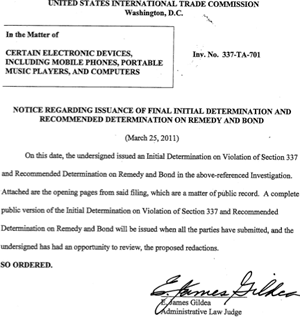 Il giudice E. James Gildea ha sentenziato (il documento è a lato) che Apple non viola i brevetti di Nokia e che può continuare ad importare in USA i prodotti coinvolti, vendendoli sul territorio nazionale.