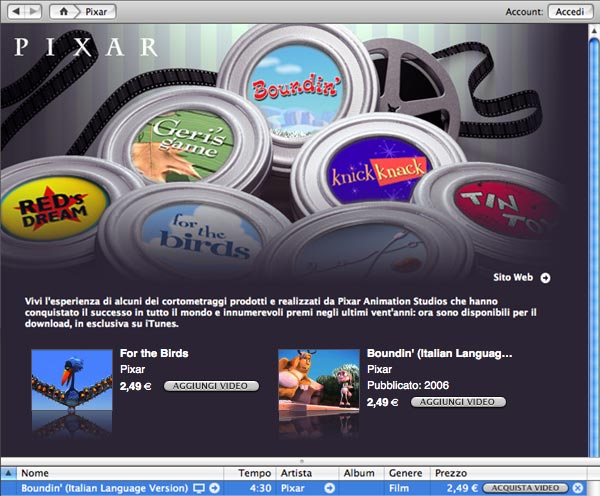 Nel consueto sorvolo delle novità settimanali di iTunes spiccano i cortometraggi di Pixar finalmente disponibili anche in Italia. Per gli USA svariati video gratis, compreso un reportage di Bono in Africa.