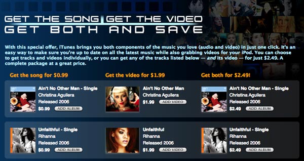 Get Both and Save. Sono disponibili 20 brani in 3 "versioni": solo audio, solo video e bundle audio + video. Nell'ultimo caso si può avere la coppia a prezzo ridotto di 2,49 dollari, invece che 2,98 dollari (0,99 + 1,99).