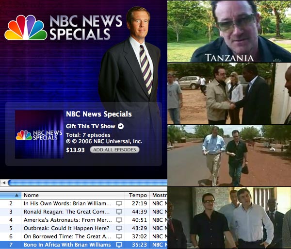 Questa settimana una delle più ricche offerte di video gratuiti da iTMS. Eccola: dal programma giornalistico della NBC News Brian Williams ha seguito Bono (leader degli U2 e da tempo impegnato nella riduzione del debito del terzo mondo) in Africa tra il 19 e il 24 maggio, ne è uscito un interessante