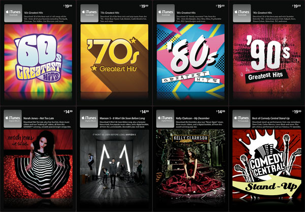 Come si vede dalle immagini allegate iTunes differenzia l'offerta in: "iTunes Essentials" con compilation a tema di una trentina di canzoni per 20 dollari, "iTunes Digital Album" che sono le versioni digitali degli album più recenti ma con l'aggiunta di tracce precedenti e videoclip del gruppo/artista assieme al libretto digitale per 15 dollari, "iTunes Digital Release" sono pubblicazioni in digitale di album con l'aggiunta di versioni speciali dei brani assieme a videoclip e libretti digitali per 15 dollari, "iTunes TV Essentials" sono raccolte di episodi degli spettacoli televisivi con extra e bonus di altre serie TV per 20 dollari.