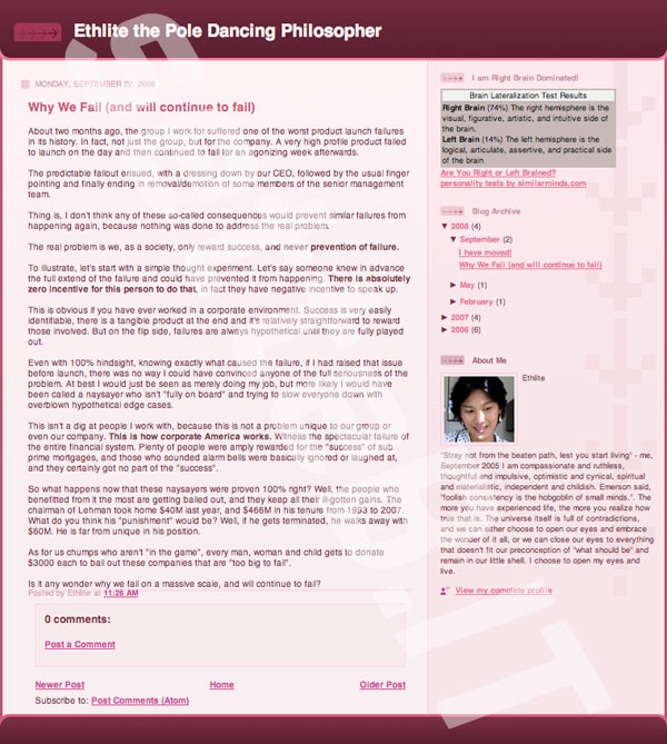 Non solo il singolo post ma l’intero blog è sparito entro poche ore dalla segnalazione di Dan Lyons (l’ex finto Steve Jobs) di ieri sera, che attribuiva chiaramente le indicazioni di Ethlite a MobileMe. Una settimana dopo la pubblicazione online Ethlite ha visto troppo evidenziata la sua critica aziendale, seppur anonima.