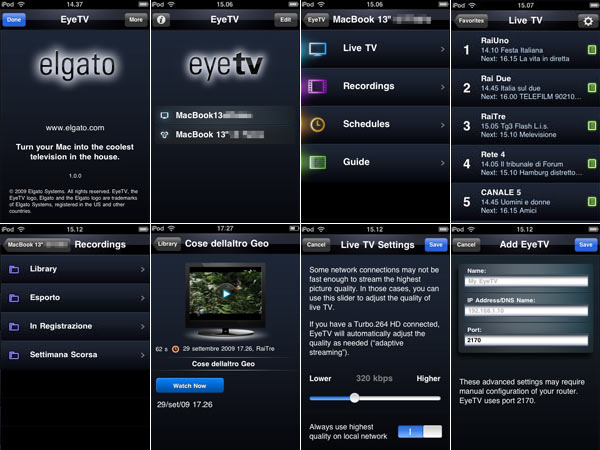 Una volta accertato che sia l’iPhone/iPod touch che il Mac sono sulla stessa rete Wi-Fi si può avviare l’applicativo su tutte e due le macchine, anche grazie a Bonjour appariranno sullo schermo del dispositivo mobile la lista dei computer con EyeTV. Si può scegliere di vedere in diretta i canali sintonizzati, le registrazioni, controllare la programmazione o consultare le guide dei programmi.
