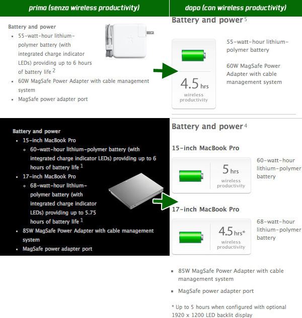 Ieri avevamo notato come i dati cambiavano molto rispetto ai precedenti modelli di MacBook e MacBook Pro, seppur non ignorando l'indicazione del "wireless productivity" apposta da Apple sui nuovi tempi di durata. In quel momento potevamo solo ipotizzare che fosse stato attivato il sistema wireless, ma niente si sapeva ufficialmente.