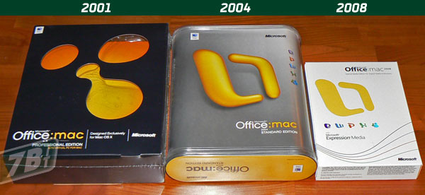 Office v.X usciva nell'autunno del 2001 anche in questa versione con VirtualPC (appena comperato da Connectix e poi abbandonato), Office 2004 arrivava in primavera di quell'anno ma sui Mac con processore Intel doveva essere emulato, Office 2008 è la prima versione Universal (seppur ancora programmata in Carbon e non multi-lingua) che funziona nativamente sui Mac con processore Intel come sui precedenti dotati di chip PowerPC.