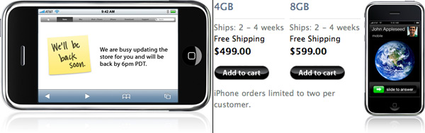Aggiornamento del 30/06/2007: sono da poco trascorse le 3 di notte e l'Apple Store online, dopo un discreto periodo di chiusura in attesa delle ore 18 sulla costa ovest degli Stati Uniti, come promesso, ha riaperto i battenti ed ha messo in vendita iPhone ed accessori. Tutto ordinabile subito (al massimo due iPhone per cliente, anche online) ma i prodotti verranno consegnati tra 2 o 4 settimane. L'iPhone da 4 GB è qui, quello da 8 GB qui. L'affollamento dei server è stato visibile con un discreto rallentamento delle pagine e, tra le 3:07 e le 3:08, addirittura l'Apple Store è andato in tilt, mostrando solo l'errore "Http/1.1 Service Unavailable".
