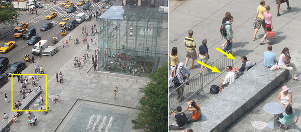 La vista aerea del piazzale davanti al GM Building di New York City mostra il cubo in cristallo dell’Apple Store della Quinta strada, nel riquadro, poi ingrandito accanto, si intravedono due signori che si godono il panorama dei taxi gialli che scorrono su una delle strade più celebrate al mondo.