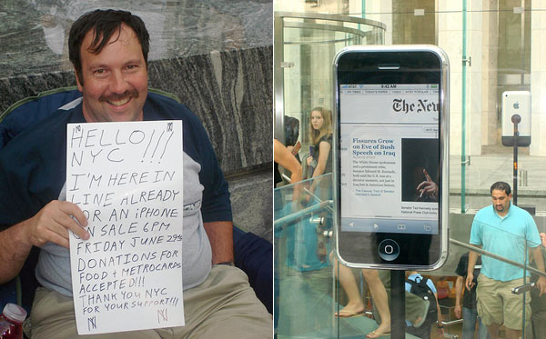 Il cartello, forse un po’ patetico, mostrato da uno dei signori già comodamente incolonnati recita: “ciao NYC!!! Sono in fila per un iPhone, che sarà in vendita venerdì 29 giugno alle ore 18, ogni donazione per cibo o Metrocard (tessere dei mezzi pubblici) sarà accettata!!! Grazie NYC per il supporto!!!