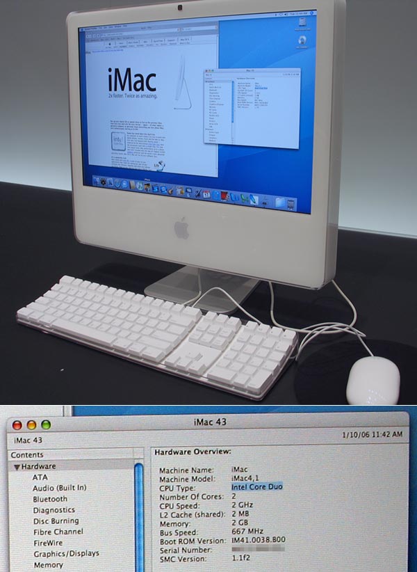 Non distinguibile dall'iMac G5, l'iMac con processore Intel appena presentato a San Francisco da Steve Jobs, mostra tutta la sua rinnovata potenza (Apple dice 2 o 3 volte quella del precedente modello) solo leggendo i dati da System Profiler.
