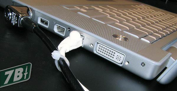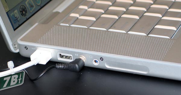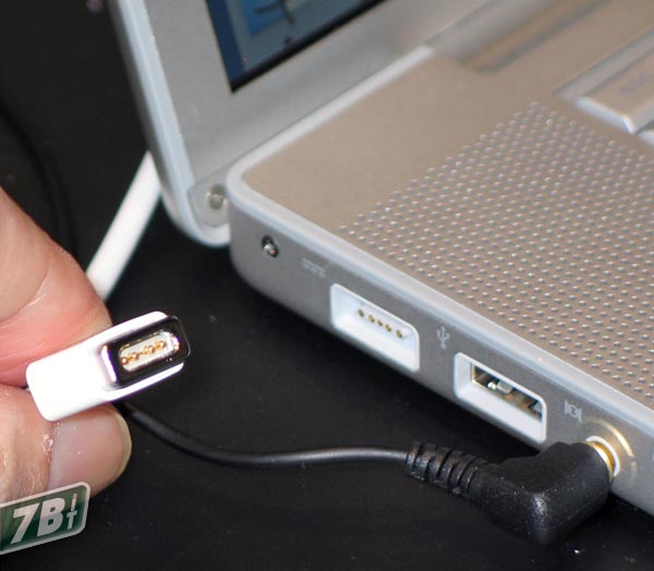 Sul lato sinistro, rispetto al PowerBook G4 da 15", non c'è più la porta del modem e quella dell'alimentatore (85W in luogo dei precedenti 65W… evidentemente necessita di più energia) viene sostituita dalla MagSafe, un connettore calamitato che resiste agli strappi accidentali. Quando collegata correttamente mostra un LED verde, dopo pochi istanti di arancio.