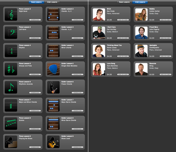 Il Lesson Store per gli Stati Uniti propone 16 "basic lessons", 7 per pianoforte, 7 per chitarra e 8 "artist lessons" per 5 dollari l'una (circa 3,90 euro): Ben Folds, Norah Jones, OneRepublic, Sara Bareilles per il piano e Colbie Calliat, Fall Out Boy, John Fogerty, Sting per la chitarra. In Canada tutto uguale ma il prezzo locale sale a 6,50 dollari (circa 4,10 euro).