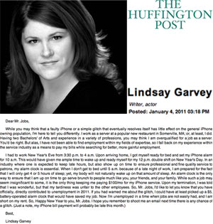 Lindsay, che d’ora in poi si alzerà dal letto al suono di una classica sveglia da 5 dollari, augura buon anno a Steve Jobs e lo accusa direttamente di aver contribuito all’indice delle disoccupazioni del 2011.