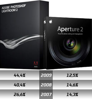 Attualmente la popolarità di Lightroom tra 1.045 fotografi statunitensi è del 44,4% contro il minimo storico di 12,5% per Aperture.