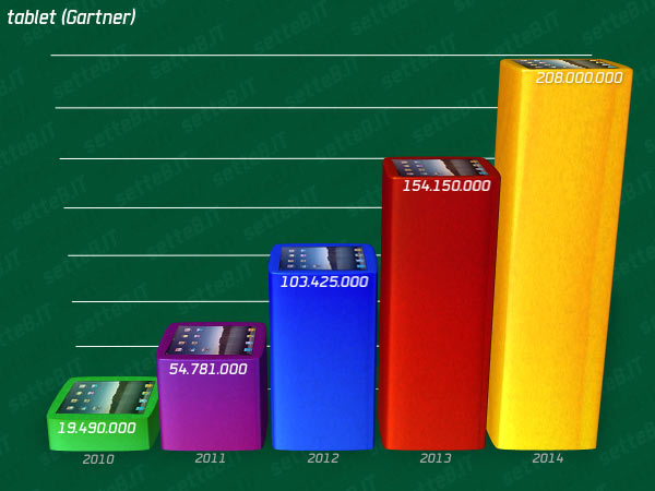 Secondo Gartner il totale dei tablet venduti quest’anno si attesterà sui 19 milioni e mezzo (il 61% in nord America), nel 2011 si salirà a 54,8 milioni di unità (+181%) e poi a quasi 103 milioni e mezzo nel 2012, a poco più di 154 milioni nel 2013 ed infine si ipotizzano oltre 208 milioni per l’anno successivo (con la quota del nord America che scenderà al 43%). Se le versioni con tecnologia cellulare/Wi-Fi pesa per il 55% quest’anno, nel 2014 raggiungerà l’80%.