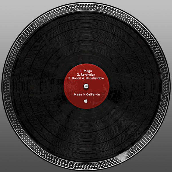 L’ingrandimento di quella immagine rivela un disco in vinile (oggetto che i più giovani nemmeno hanno mai visto) posato su un piatto di un giradischi a trazione diretta, con questa simbolica etichetta delle “canzoni”: 1) Magic, 2) Revolution, 3) Boom! e 4) Unbelievable. Il tutto “firmato” con “Made in California”, la variante della dicitura “designed by Apple in California” che troviamo (accanto a “assembled in China”) in tutto l’hardware degli utlimi anni.