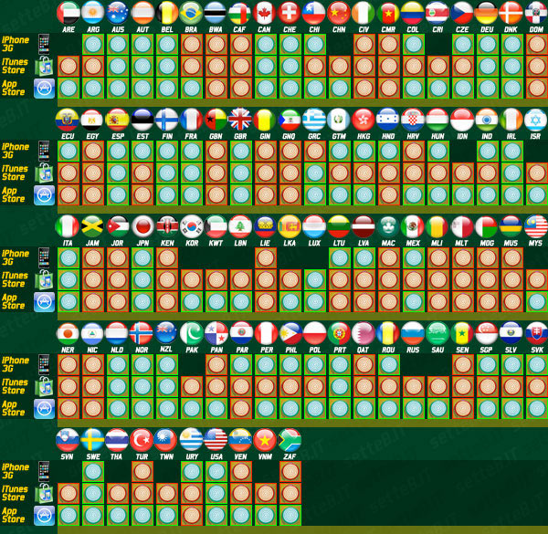 Nella tabella sottostante trovate tutti e tre i prodotti/servizi: iPhone 3G, iTunes Store ed App Store, aggiornati ad oggi e riferiti al 22 agosto. Le nazioni sono in totale 90, ben 62 avranno entro l'anno in corso l'iPhone 3G, già adesso sono 22 e diventeranno 43 entro un paio di settimane. Nelle 18 senza indicazione Apple non ha ancora annunciato l'eventuale disponibilità dello smartphone.