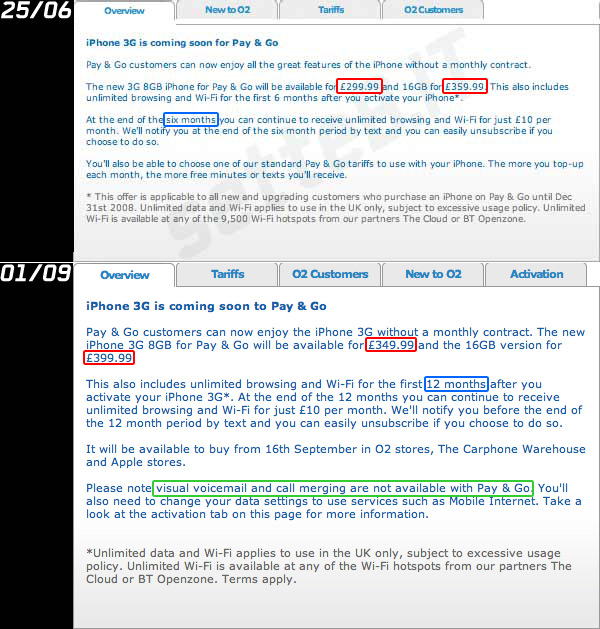 Il 25 giugno sfuggivano online i prezzi che O2 pensava per le due versioni dell'iPhone 3G, 300 e 360 sterline (370 e 450 euro), dopo poco sparivano. Oggi O2 pubblica i prezzi ufficiali dopo un lungo ripensamento: 350 e 400 sterline (435 e 495 euro). Un discreto aumento.