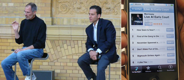 Grazie agli amici di iFUN, che hanno autorizzato setteB.IT ad usare tali immagini, possiamo mostrarvi Steve Jobs in compagnia di René Obermann (T-Mobile) che a Berlino hanno presentato l'iPhone. Accanto potete vedere l'iTunes Wi-Fi Music Store in versione tedesca.