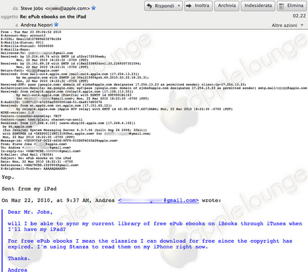Forse l’ultimo della serie è stato il messaggio inviato poche ore fa dal moderno amanuense di Cupertino ai colleghi di TheAppleLounge, con appunto quel “sì” comprensibile soprattutto a chi è madrelingua inglese, disinteresse se l’interlocutore dal nome evidentemente italiano capirà lo slang. Con tanto di intestazione che prova l’autenticità del messaggio, eccolo a fondo articolo.