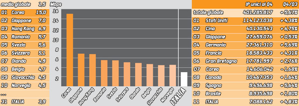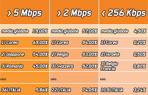 La banda media disponibile a livello mondiale è di 1,5 Mbps. In Corea la media raggiunge ben 15 Mbps, segue il Giappone con 7 Mbps ed Hong Kong con 6,9 Mbps. Bisogna scendere fino alla 31esima posizione per trovare l'Italia con 3,9 Mbps di media disponibili. Gli Stati Uniti sono 17esimi con una velocità di 3,9 Mbps.