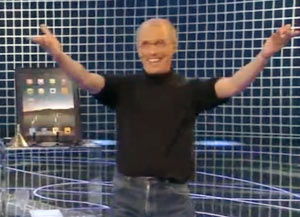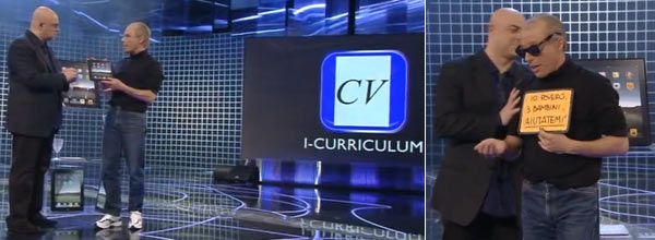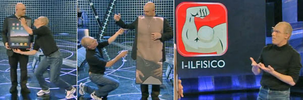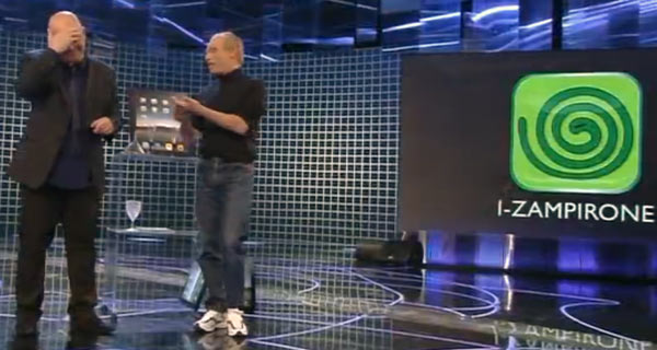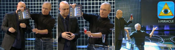 Certo, poi viene sete. Il “mago” Steve Jobs in versione per la televisione italiana riesce prima a far uscire da un iPak dell’acqua e poi del vino rosso. Tutto merito dell’applicazione “iMiracle” che ha fatto questa trasformazione, per la moltiplicazione del pane e del pesce, ripassare la prossima stagione.
