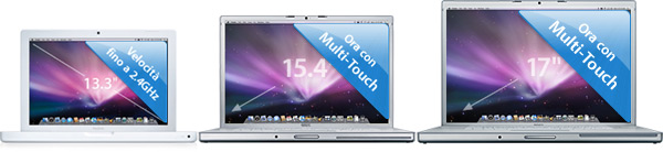 Calano tutti i prezzi in euro. Processori più potenti ed hard disk più capaci per i laptop di Cupertino. Il MacBook Pro integra il multi-touch come quello già visto su MacBook Air. In opzione il 17" LED ma bisogna aggiungere 90 euro. Aggiornato.