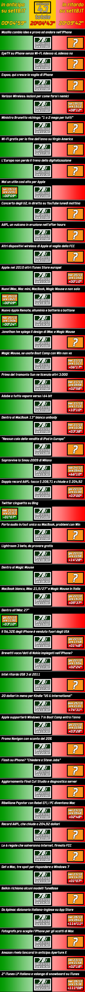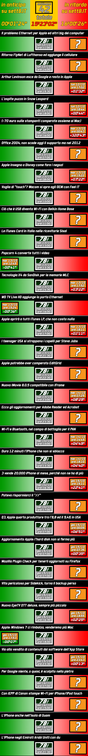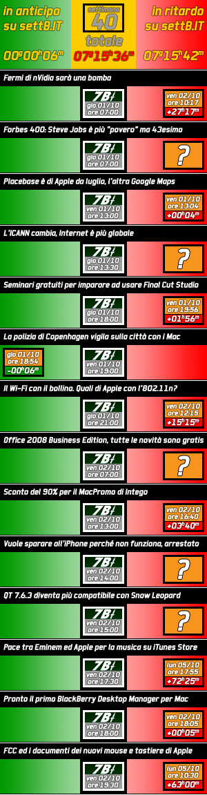 Nelle tabelle che presenti qui sotto in miniatura (cliccatele per tutti i dettagli) vedete elencati gli articoli più significativi di setteB.IT con la data di pubblicazione, in campo rosso potete leggere il ritardo dell’articolo concorrente più assimilabile, in campo verde l’eventuale anticipazione. Si va da pochi minuti a giorni di differenza, alla faccia del mezzo rapido e scattante come Internet, anche se setteB.IT non pubblica generalmente durante il sabato e la domenica.
