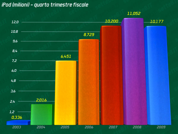 Il modello che aumenta del 100% le vendite è l’iPod touch. bene anche gli iPod nano con videocamera integrata.