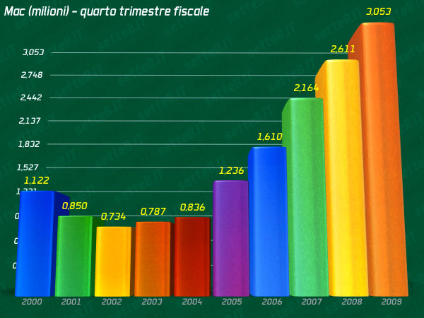 Ottimi numeri soprattutto per i laptop, che rappresentano il 74% dei Mac venduti nel trimestre. In effetti l’unico settore leggermente negativo è quello dei Mac desktop, ma forse qualche aggiornamento è imminente. Soddisfazioni dal mercato education statunitense. Gli aggiornamenti a Snow Leopard sono stati molto superiori di quello che è successo in passato, circa il doppio di quanto era avvenuto nelle prime 5 settimane di vita di Leopard.