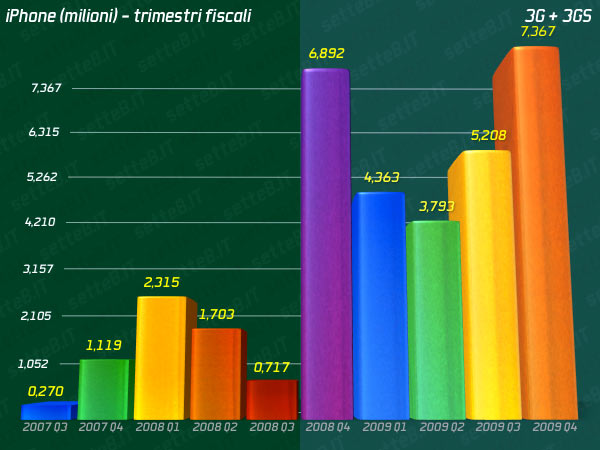 I Mac venduti nel trimestre sono stati 3,053 milioni (+17%) mentre gli iPod 10,177 milioni (declino dell’8% sullo stesso periodo di un anno fa) e gli iPhone 7,367 milioni (+7%). Ottimo progresso di vendite per l’area Asia-Pacific con +42%.