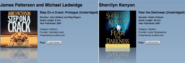 Per gli audiolibri, Apple sceglie di regalarne due: "Step On a Crack" (il prologo di 8 minuti) di James Patterson; un estratto e una presentazione di 45 minuti di "Fear the Darkness" scritto da Sherrilyn Kenyon.