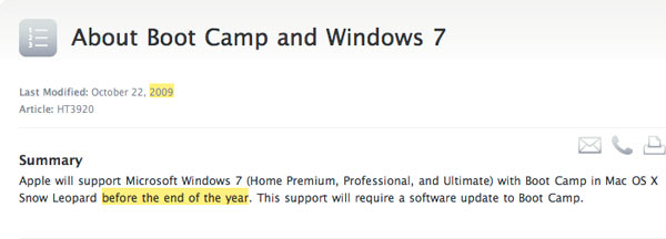 Il giorno dell’uscita del sistema operativo Windows 7, lo scorso 22 ottobre, Apple prometteva di supportarlo attraverso Boot Camp del Mac OS X entro “la fine dell’anno”.