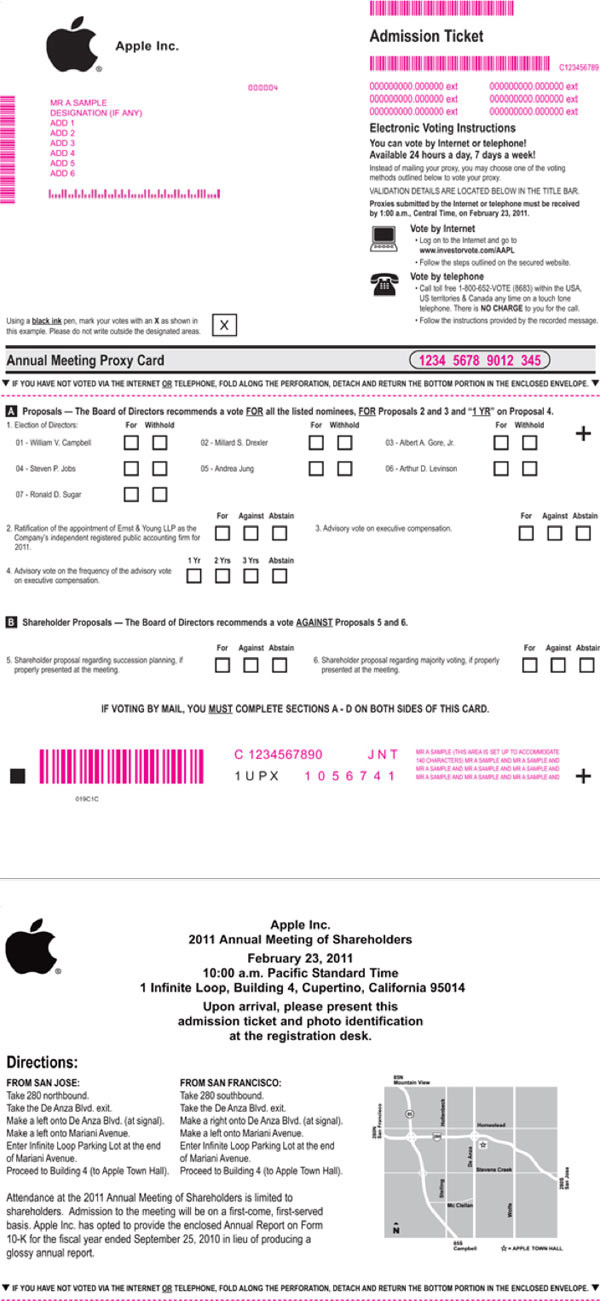 Ecco la scheda di votazione e riassunto del bilancio di Apple, per chi non avrà esercitato il proprio diritto d’azionista in anticipo con il voto online.