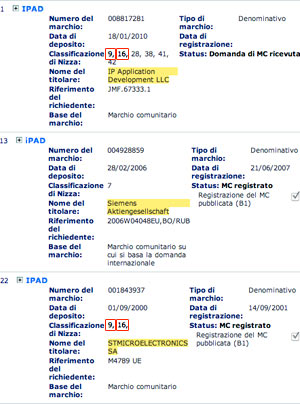 La società italo francese con sede in Svizzera detiene dal 2001 il marchio comunitario “IPAD” e lo può utilizzare per due classificazioni, le stesse 9 e 16 che anche IP Application Development ha ottenuto, con l’aggiunta però della 28, 38, 41 e 42. La classe 9 sarebbe quella più appropriata per un tablet.