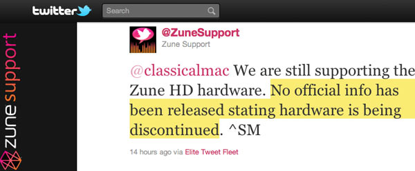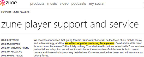 Aggiornamento del 05/10/2011: il supporto di Zune ha le idee un po’ confuse, un giorno dice che Microsoft non farà più player Zune ed un altro si contraddice. Eutanasia, per favore.