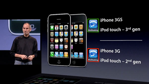 Ma non per tutti, Steve Jobs ha spiegato che il multitasking sarà fornito solo agli utenti con iPhone 3GS ed iPod touch di terza generazione, perché l’hardware dell’iPhone 3G ed iPod di seconda generazione non potrà supportarlo.
