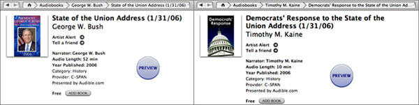 Da buoni patrioti (mediamente) gli statunitensi ottengono da molto tempo attraverso iTunes Music Store USA varie registrazioni audio "istituzionali". Al tempo delle audizioni senatoriali della "commissione 9/11" ognuna delle 37 registrazioni furono messe a disposizione gratuitamente su iTMS; lo stesso dicasi per i 4 dibattiti ultra-regolamentati nella campagna presidenziale 2004, che ha portato Bush e Cheney ad essere rieletti presidente e vice-presidente USA.