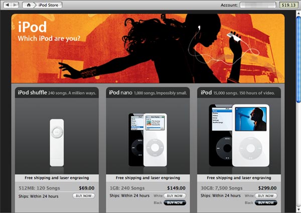 Da qui con i dati già forniti per gli acquisti di musica e video dall'iTunes Music Store si può comperare un iPod shuffle, un iPod nano o un iPod, tutti i modelli attuali.