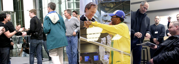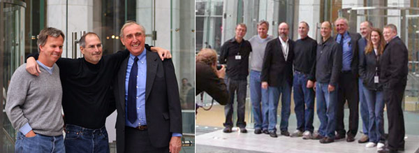 Pare proprio che sia stato volentieri presente all’inaugurazione (starà cambiando opinione sul rapporto ravvicinato con la sua clientela affezionata?), ha posato sorridente davanti all’ingresso, assieme ai due più stretti collaboratori dell’operazione Apple Store: Ron Johnson, responsabile retail (in maglia grigia) e George Blankenship, responsabile real estate (in giacca e cravatta).