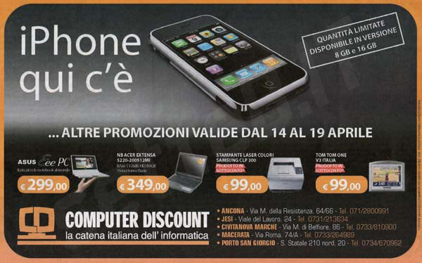Un quantitativo limitato di iPhone da 8 e 16 GB è in vendita in quattro negozi Computer Discount delle Marche.