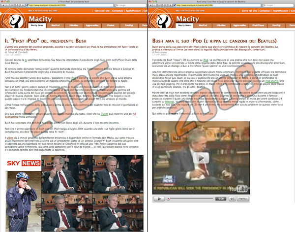Sullo stesso sito si può ancora trovare (per fortuna esistono le cache dei motori di ricerca, nel caso da adesso in poi sparissero, ndr) l'articolo "Il "First iPod" del presidente Bush" del sottoscritto. Ebbene sì, la colpa di aver contribuito con qualche migliaio di articoli alla crescita dell'allora unica fonte italiana di notizie su questo mondo, andrà primo o poi espiata.