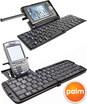 La "tastiera wireless con tecnologia Bluetooth – QWERTY" ora offre cinque file di tasti a misura standard, numeri compresi ed è ripiegabile per portarla comodamente in giro assieme al proprio dispositivo Palm.